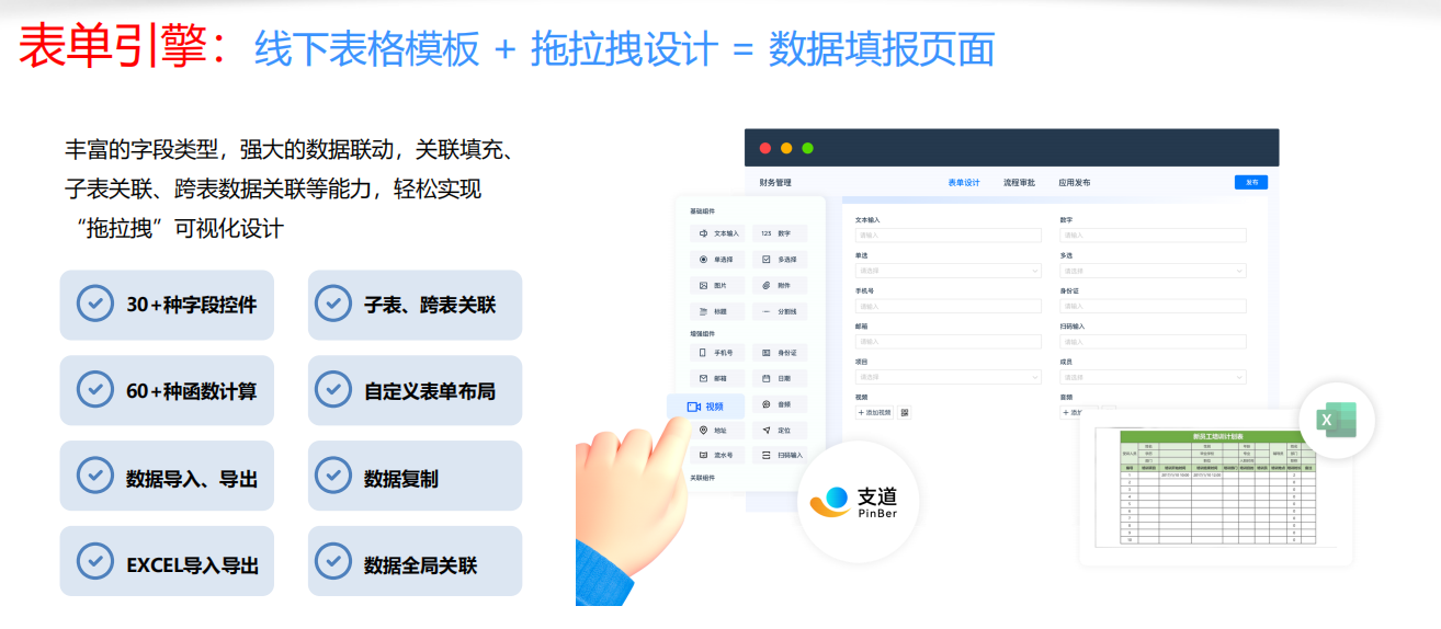 这用以替代Excel。用户可以通过拖放30多种不同类型的字段控件(如文本、数字、日期、附件、关联字段等),快速创建出数据填报页面。它不仅是简单的填报,还支持强大的数据联动能力,如子表关联、跨表数据引用、自动计算(内置60多种函数)等 ,从源头上保证了数据的规范性、准确性和关联性。