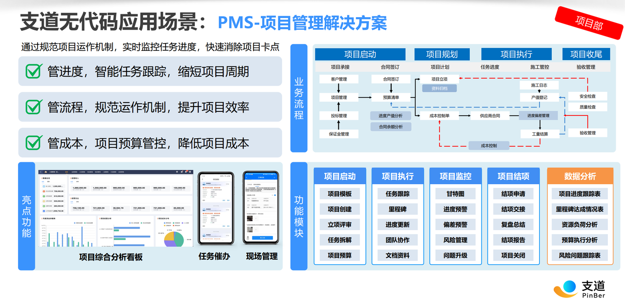 - 项目型业务解决方案:针对研发、工程及服务类企业,支道提供了以项目为核心的经营管理方案。它能够实时归集项目过程中的人工工时、采购成本及费用报销,让管理者随时掌握项目进度与盈亏状况,告别项目延期与成本失控。