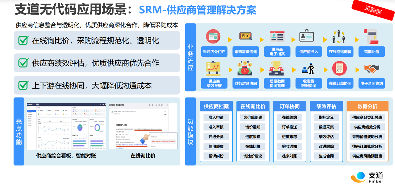 - 供应链协同解决方案:支道打破了企业围墙,提供了上下游协同能力。企业可以邀请供应商在线协同,实现采购订单的实时确认、发货通知及对账结算的数字化,极大提升了供应链的响应速度。