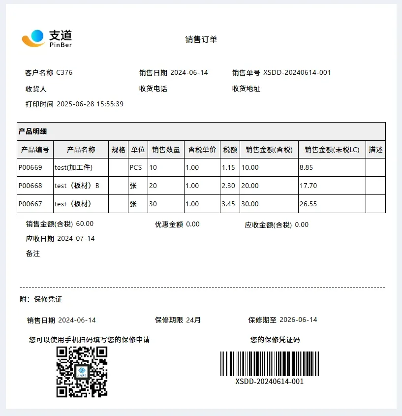 以销售订单为例,我们可以提前将合同模板导入系统,在例如“销售产品、销售数量、金额”等空白处,绑定表单字段,表单录入后,系统将根据录入的信息自动填入文档中,并生成一份纸质合同。